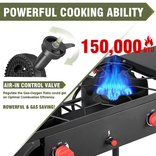 双头丙烷炉户外露营燃气炉150,000 BTU自动点火带调节器和侧架非常适合露台家庭烹饪和煎炸