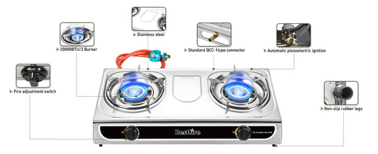 23,000 BTU 便携式双燃烧器丙烷炉,带自动点火功能 - 不锈钢露营炉,适用于户外烹饪和应急使用