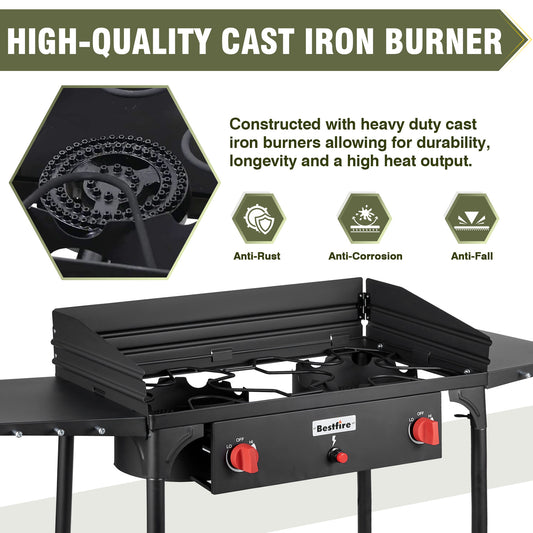 双头野营炉,带挡风板和侧架、包、自动点火按钮、调节器、150,000 BTU 野营炉丙烷燃烧器,带可拆卸支腿,适用于户外烧烤和后院