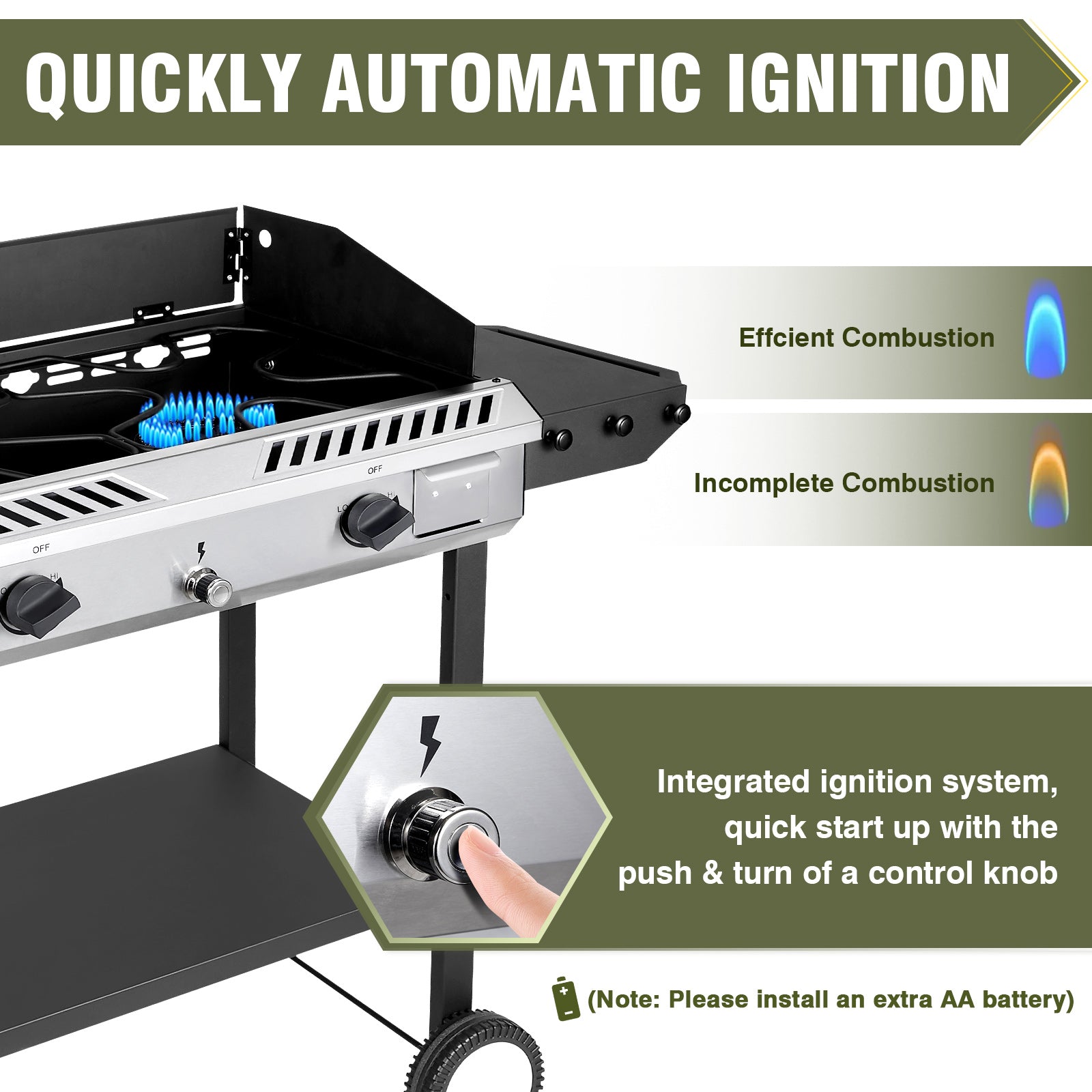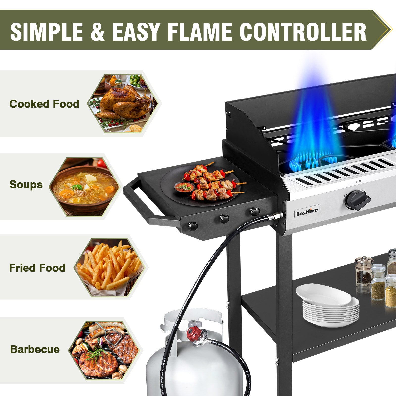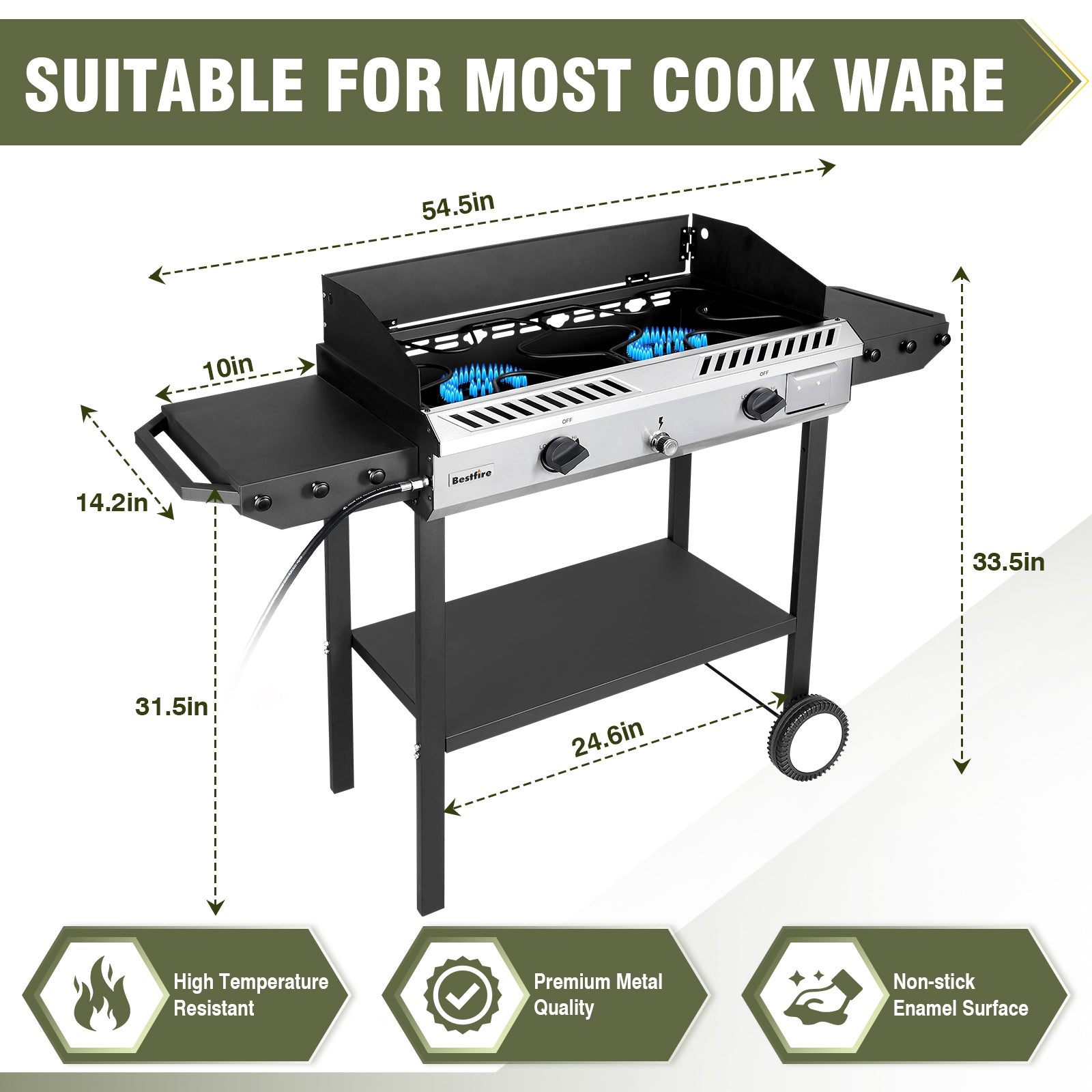 - 火力强劲:Bestfire 野营炉配备两个独立控制的 75,000 BTU 铸铁炉头(总功率 150,000 BTU),并配备 20P 调节器。每个炉头均可从低火到高火调节,提供强劲火焰,满足您所有家庭烹饪需求。