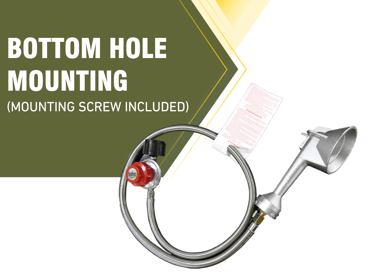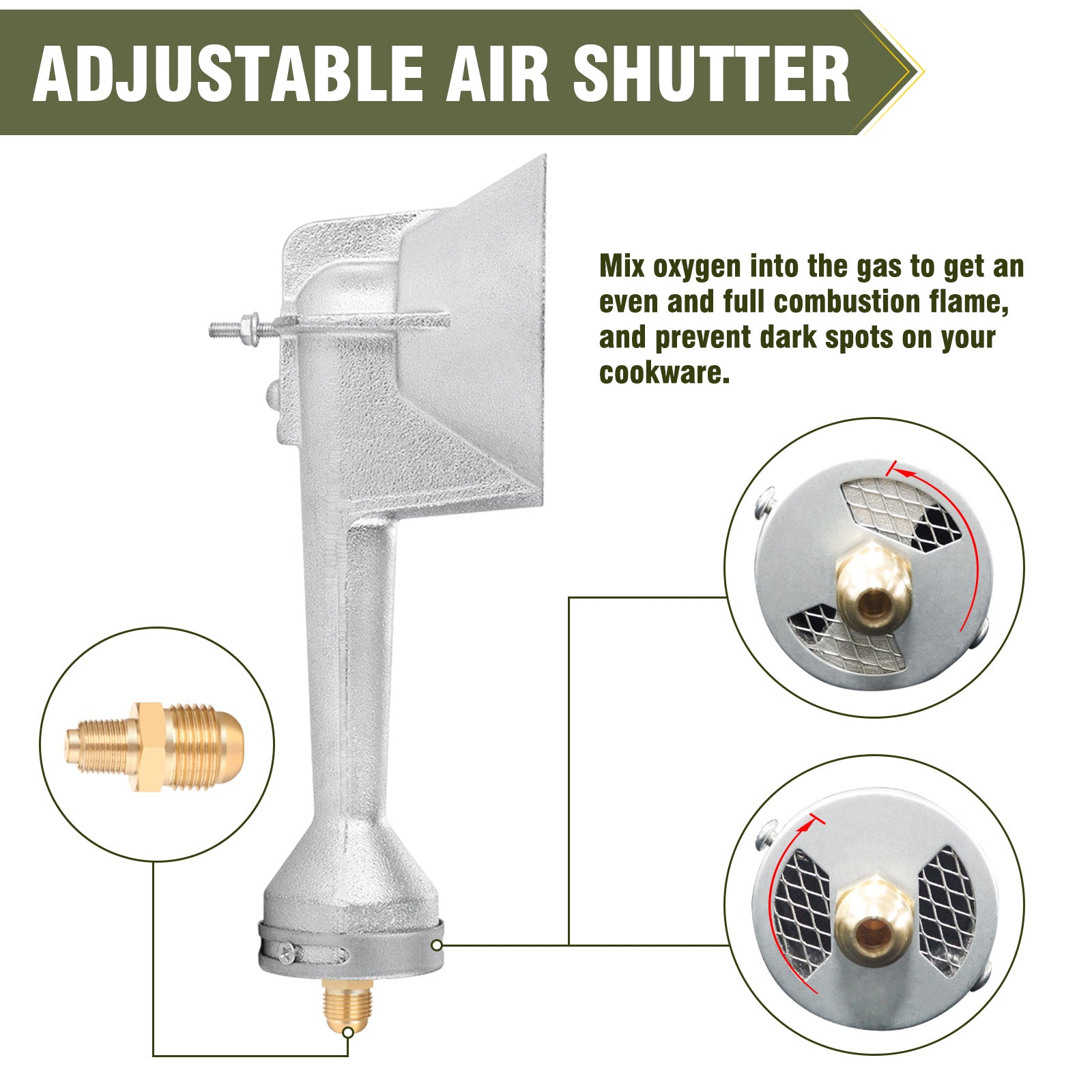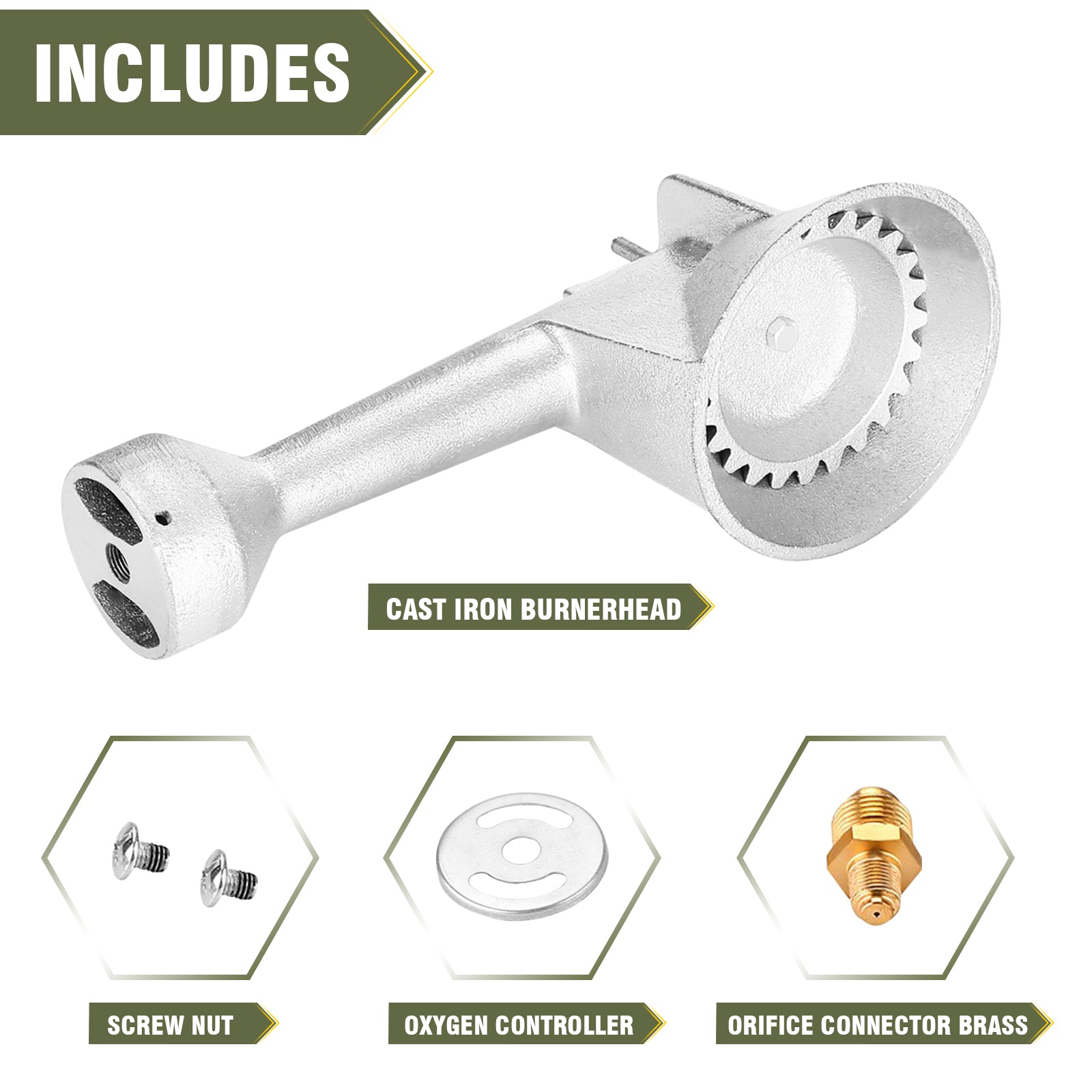 - 产品:包括一个铸铁高压燃烧器头、一个黄铜配件和一个 4.1 英尺高压丙烷软管,配有 0-20 psi 调节器、空气挡板、螺丝和弹簧包