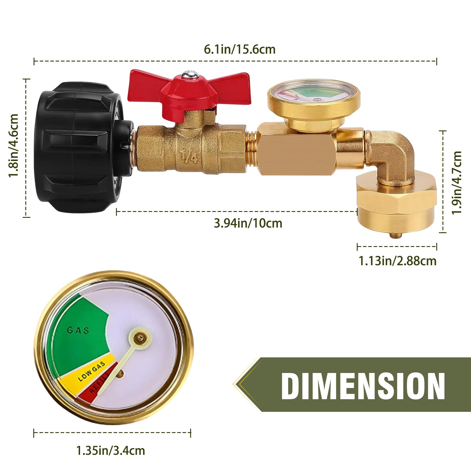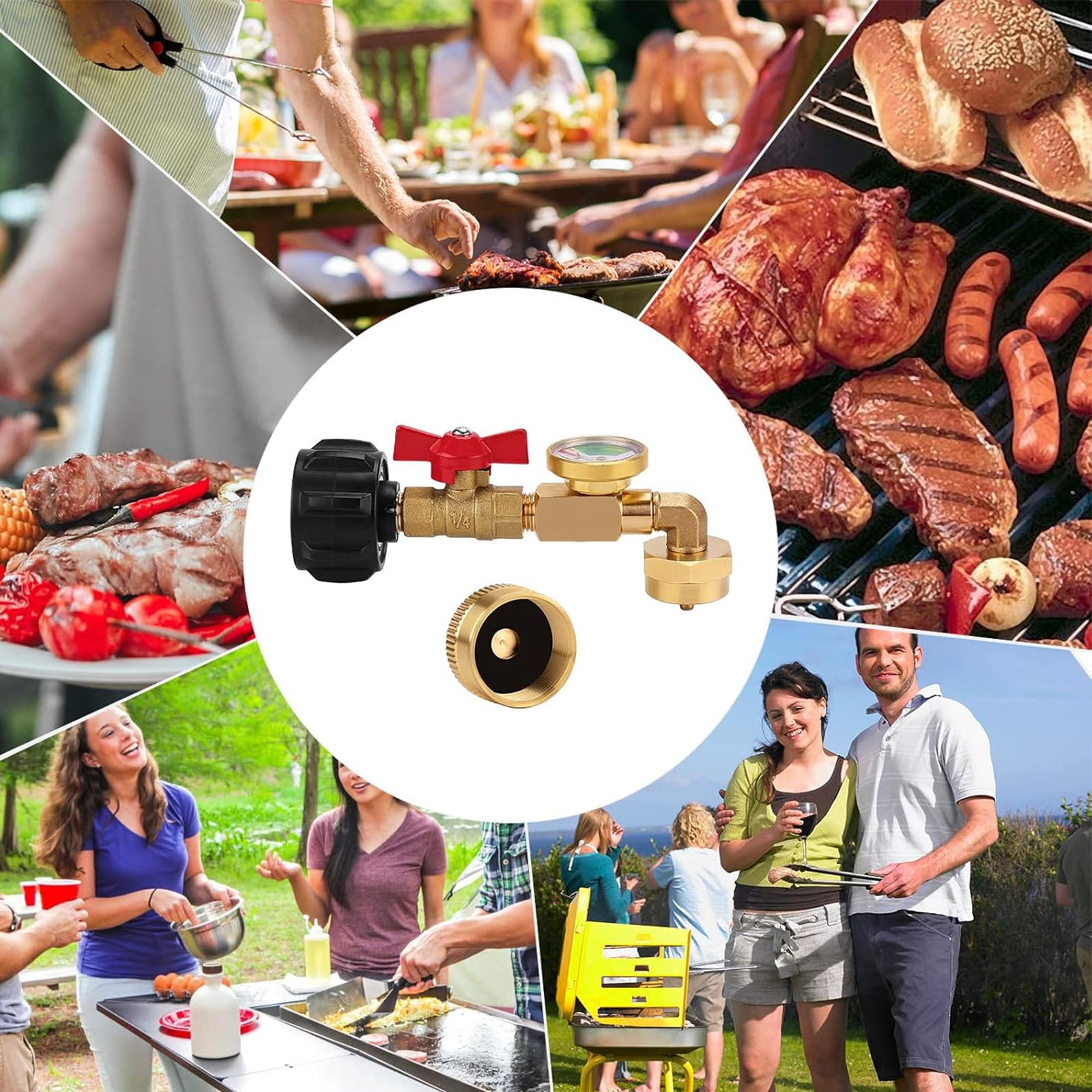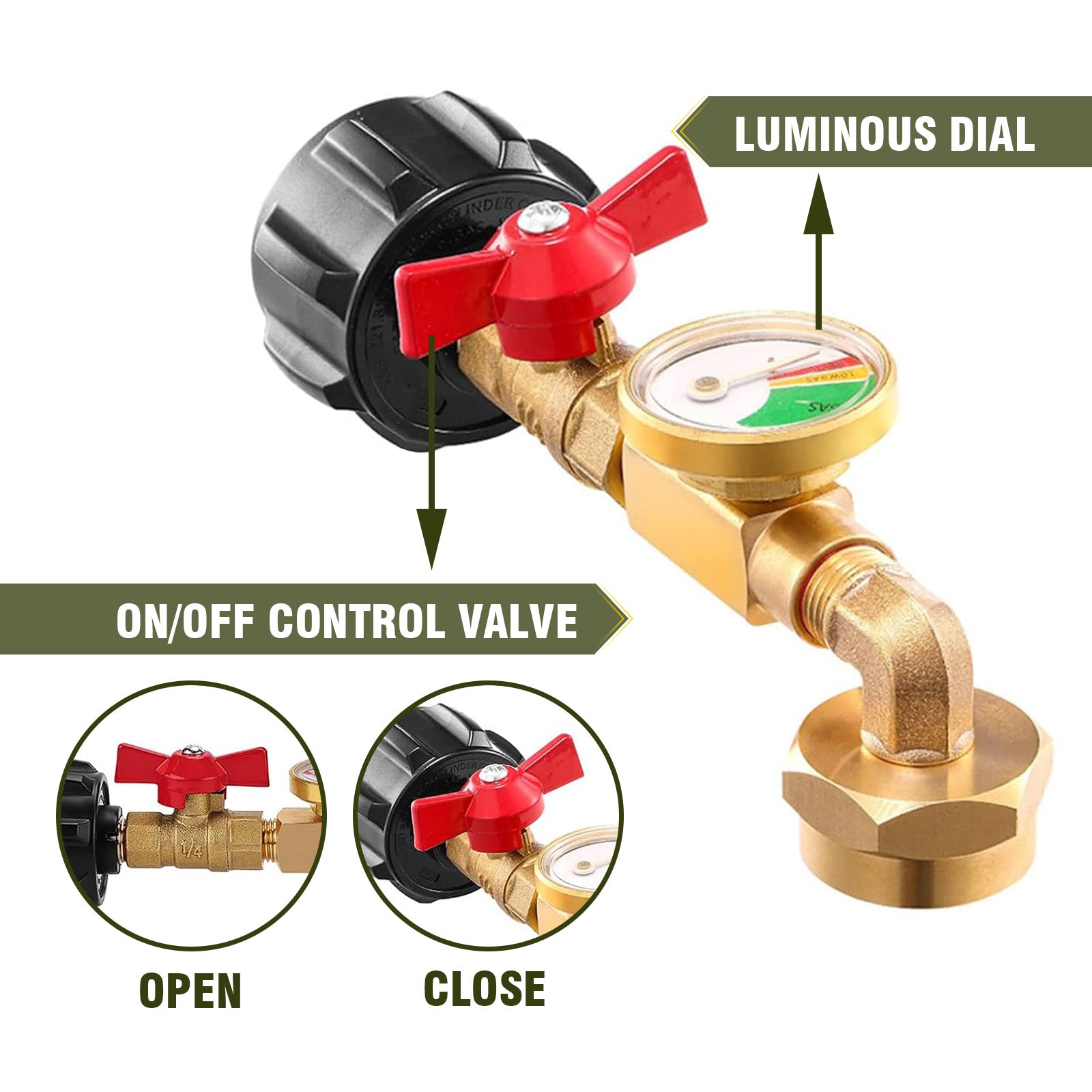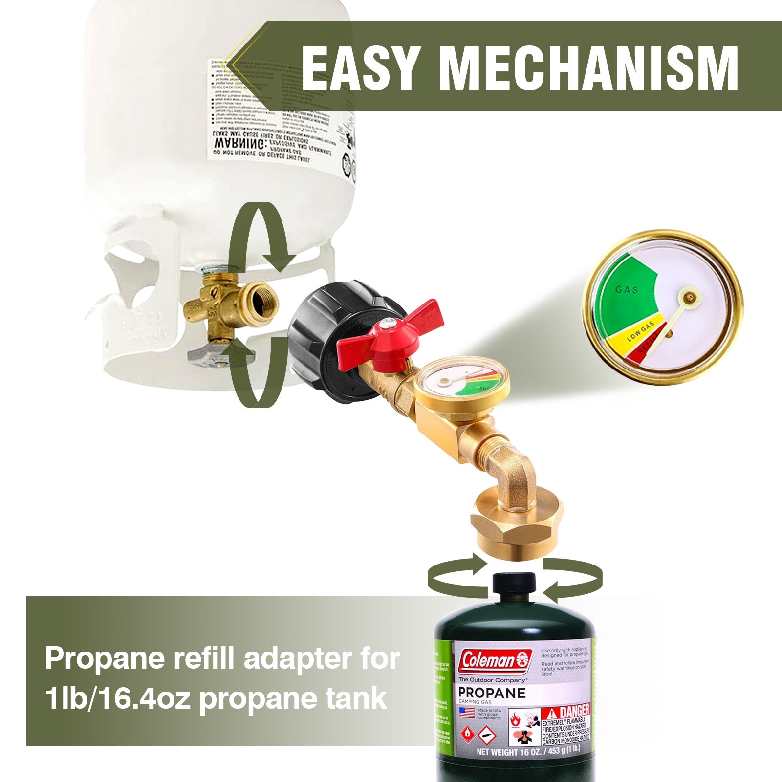 - 【快速轻松加气】创新的 90° 弯头设计,可在几秒钟内将 20-40 磅的大型丙烷气罐无缝连接到 16 盎司(1 磅)的一次性气瓶。不到 1 分钟即可充满,省去了传统适配器的耗时过程。内置压力表提供实时监控,确保精确加气并防止溢流。