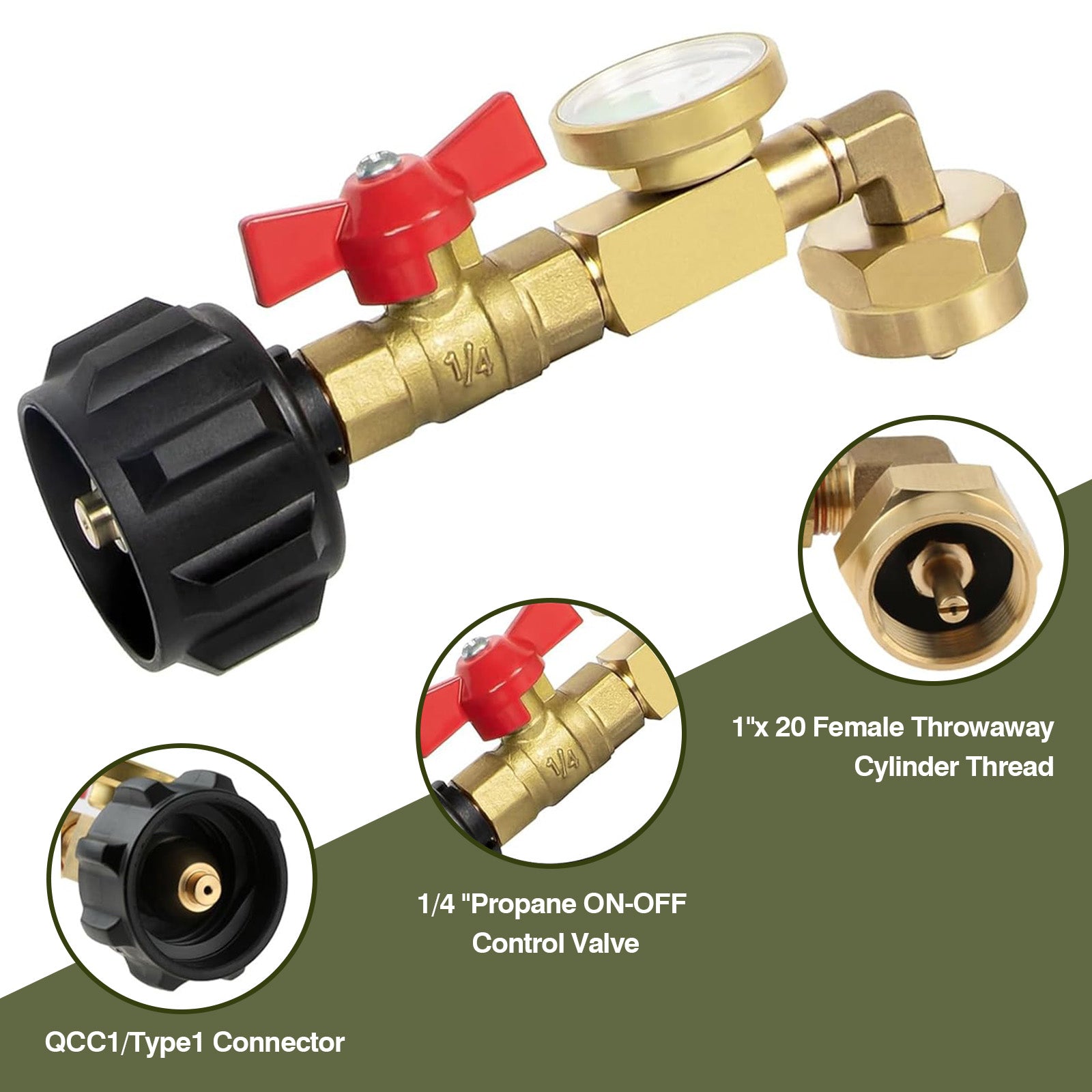 - 【通用兼容性】标准 QCC1/Type 1 接头兼容众多知名品牌,1 英寸 - 20UNF 内螺纹可兼容所有 1 磅一次性丙烷和丁烷气瓶。其用户友好型设计无需特殊工具;只需连接、倒置大容量气瓶,然后打开阀门,即可享受轻松无忧的加气体验。