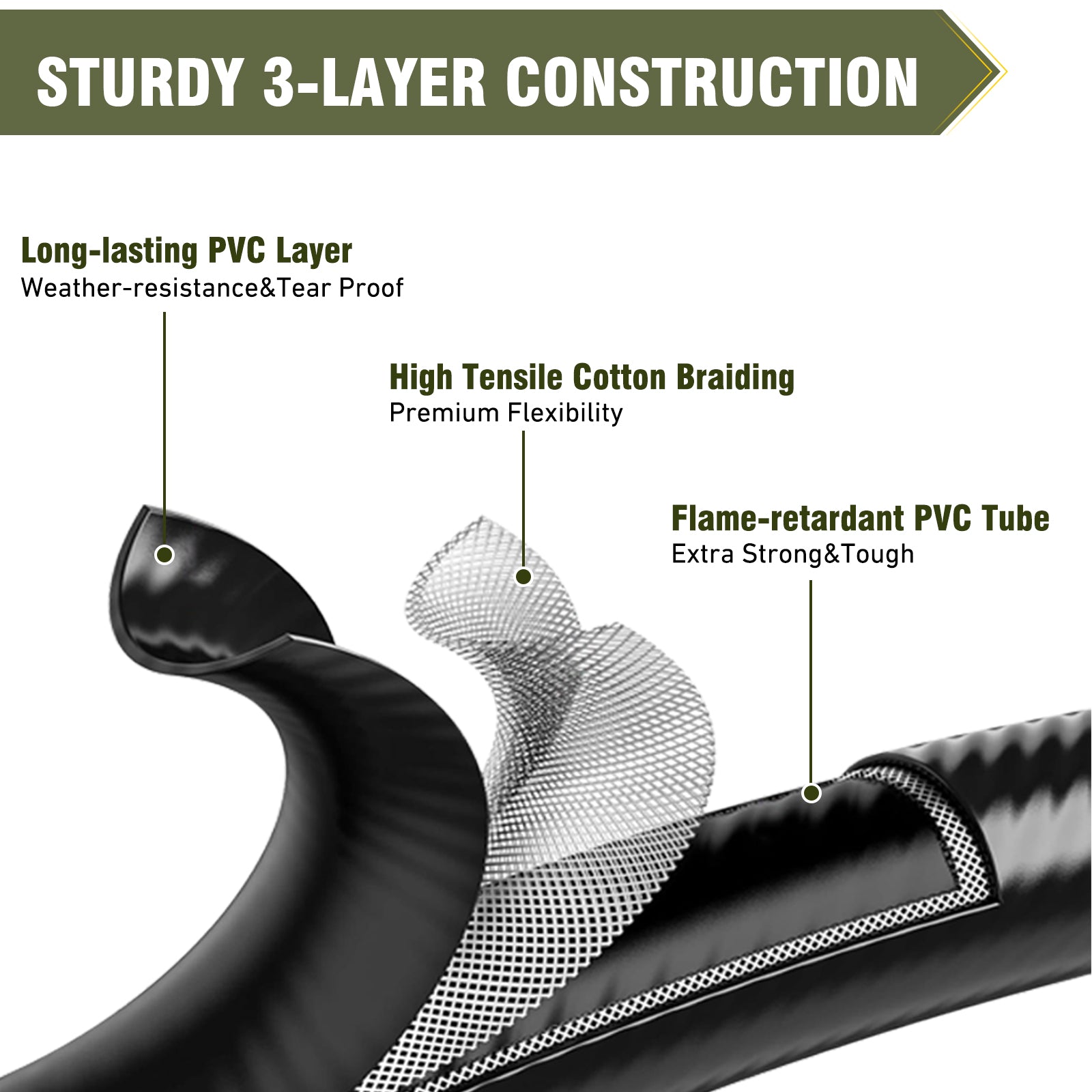 - 坚固耐用:采用优质耐用 PVC 层和实心黄铜制成,连接牢固。这款丙烷软管不仅耐磨损、耐腐蚀,还能有效防止动物啃咬。此外,它还具有出色的气密性和热密封性,提供安全可靠的连接。