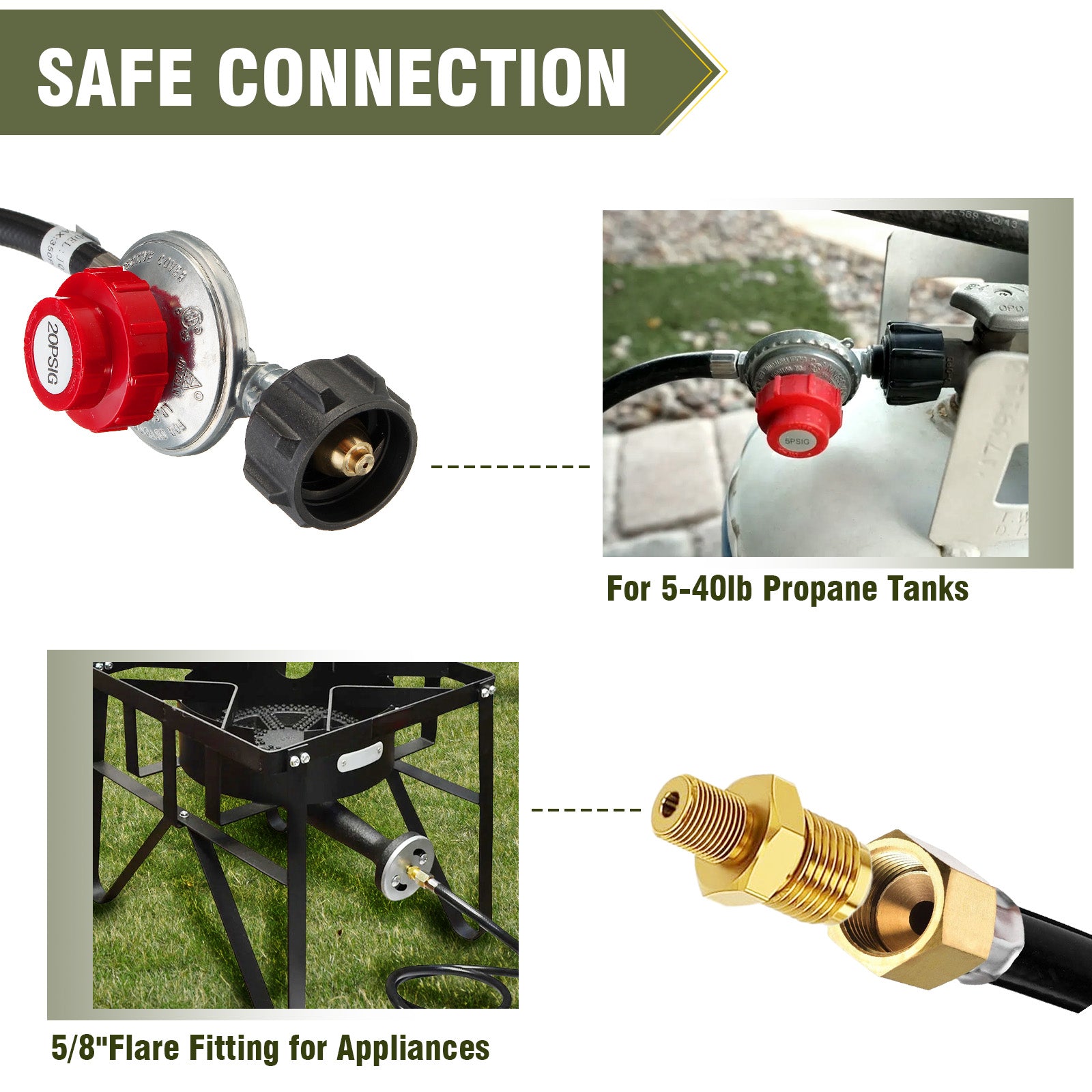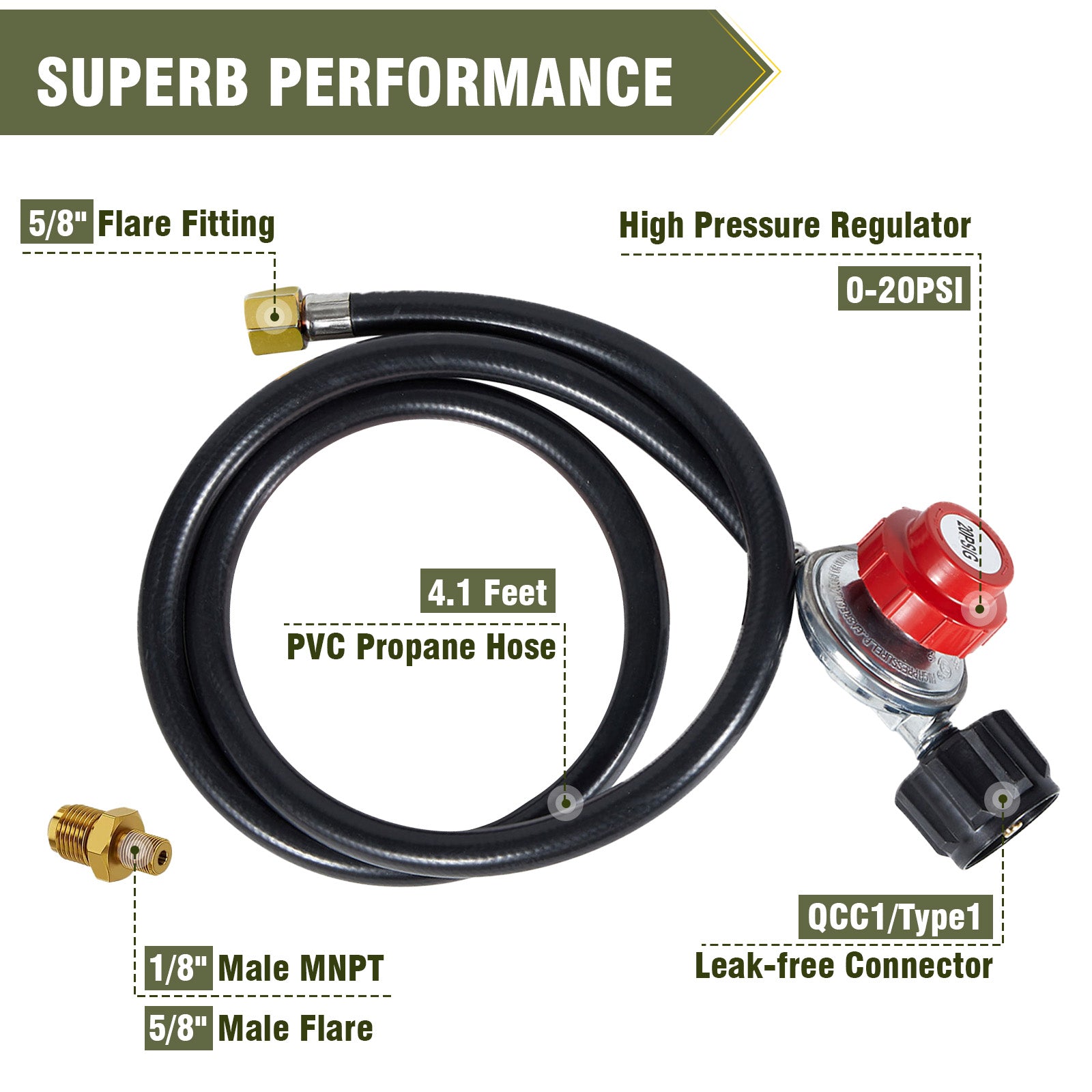 - 兼容性广:QCC-1 丙烷罐调节器输出范围可调,0-20 PSI,适用于丙烷燃烧器。该软管长度 4.1 英尺,设计用于牢固连接 1 型 (QCC-1) 丙烷罐配件,并配有内部 1/4 英寸喇叭口接头和外部 5/8 英寸直径的接头,确保可靠紧密的配合。